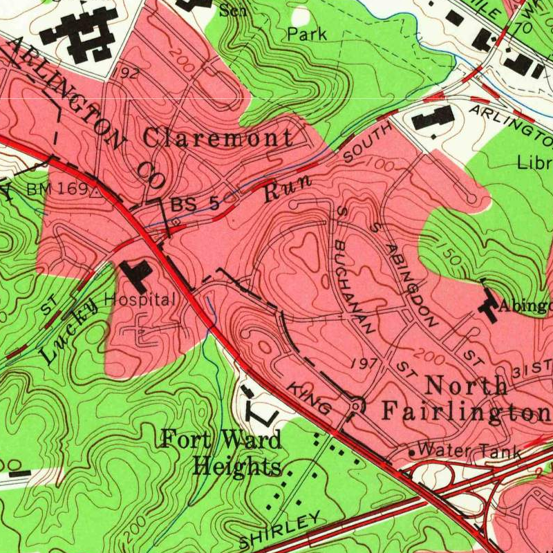 However, the modern boundary between Arlington and Alexandria within Fairlington does not resemble the one laid out by Andrew Ellicott. It is not straight. It hews along roads that have only existed since Fairlington was built. This was the result of a 1965 land swap between Arlington and Alexandria.1 The impetus for the swap was Arlington’s need to acquire land from Alexandria to expand the county’s sewage treatment facilities. This land was well east of Fairlington, but the two counties took the opportunity to negotiate broader adjustments of their entire boundary since the state government had provided them the authority to do so.